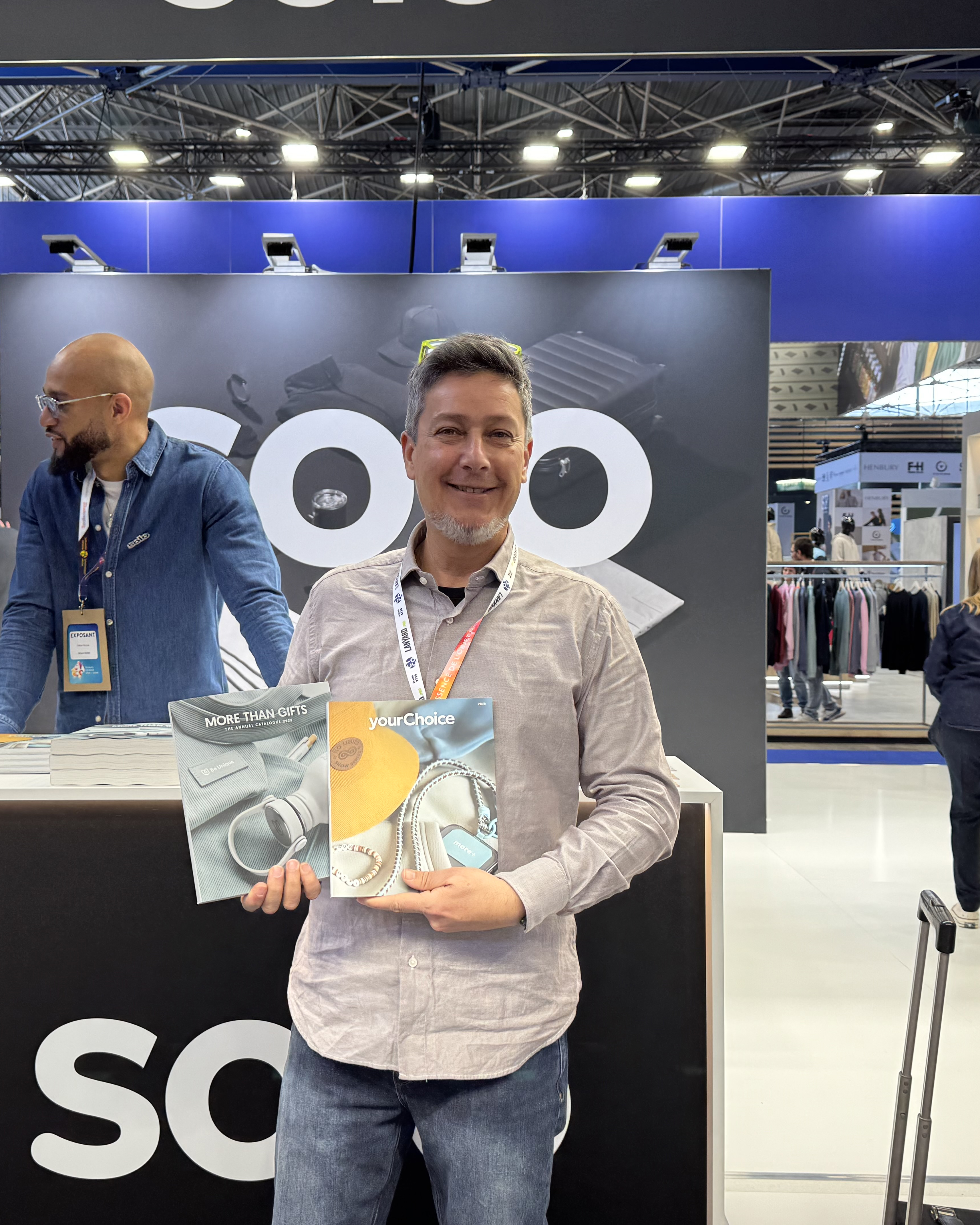 Durante el tradicional momento fotográfico de la feria, nuestra directora de arte posó con los catálogos, destacando el valor tangible de lo impreso en un mundo dominado por pantallas. Los catálogos no solo presentan la gama de productos, sino que también transmiten la identidad visual y la narrativa que definen el universo de SOLO.